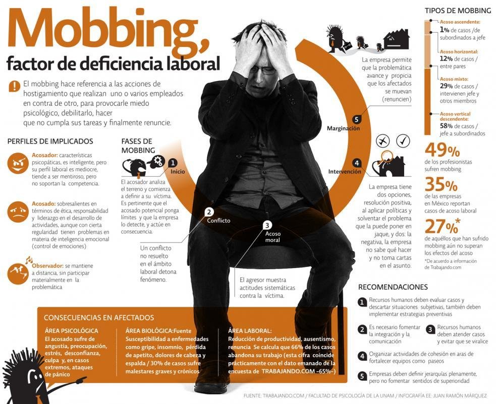 Un gran problema que conlleva a la deficiencia laboral por parte de los empleados afectados, triste y dura situación. Aquí una imagen descriptiva de los sucesos del mobbing. (Click en ella para ampliar)
